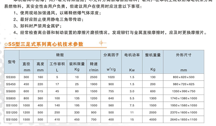 SS型三足式離心機為人工上部卸料、間歇操作的離心機。按分離原理可分為過濾(SS型)、沉降(SSC型)等多種類型。