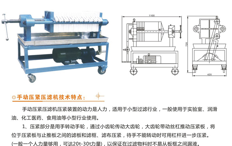 手動壓緊壓濾機壓緊裝置的動力是人力,適用于小型過濾行業, 一般使用于實驗室、潤滑油、化工醫藥、食用油等小型行業使用。