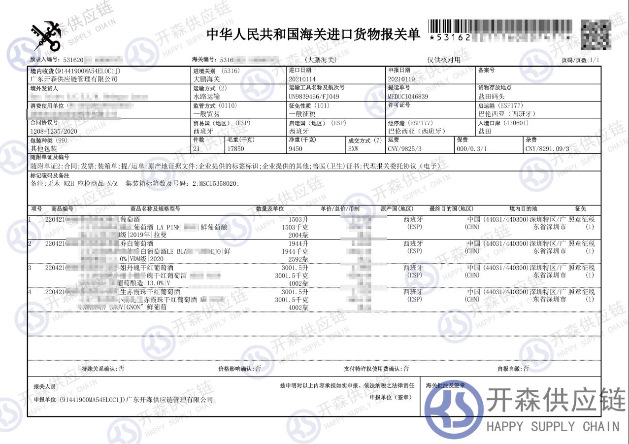上述就是【進(jìn)口案例】西班牙葡萄酒進(jìn)口報關(guān)代理服務(wù)的全部內(nèi)容,希望能對您有所幫助,如有葡萄酒進(jìn)口報關(guān)上任何疑問及問題可隨時在線聯(lián)系我們或撥打 18002611553,開森供應(yīng)鏈擁有豐富的葡萄酒進(jìn)口報關(guān)操作經(jīng)驗及案例,10余年進(jìn)口經(jīng)驗為您所用,各類進(jìn)口疑難都能為您一一解答及協(xié)助快速處理解決!
