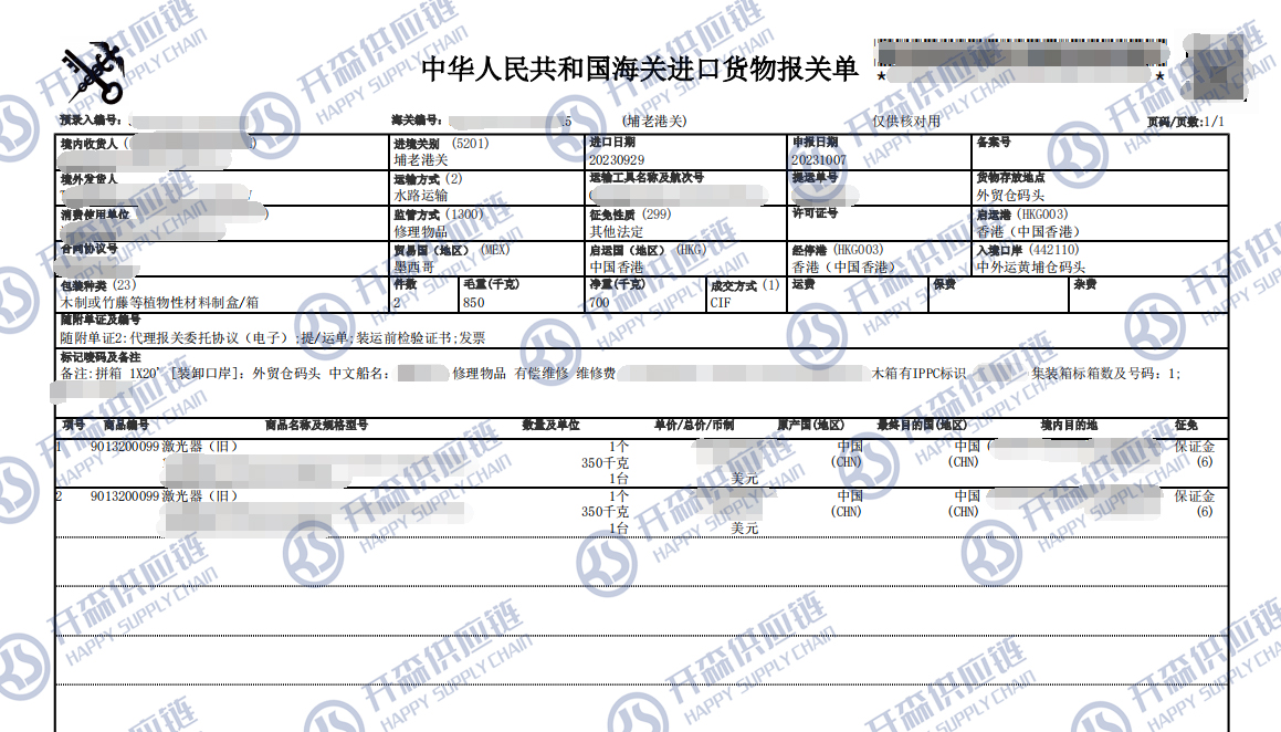 【本文結語】 上述就是廣州港舊激光器退運返修報關代理服務【清關案例】的全部內容,希望能對您有所幫助,如有退運進口報關上任何疑問及問題可隨時在線聯系我們或撥打 18002611553,開森供應鏈擁有豐富的退運進口報關操作經驗及案例,10余年進口經驗為您所用,各類進口疑難都能為您一一解答及協助快速處理解決!